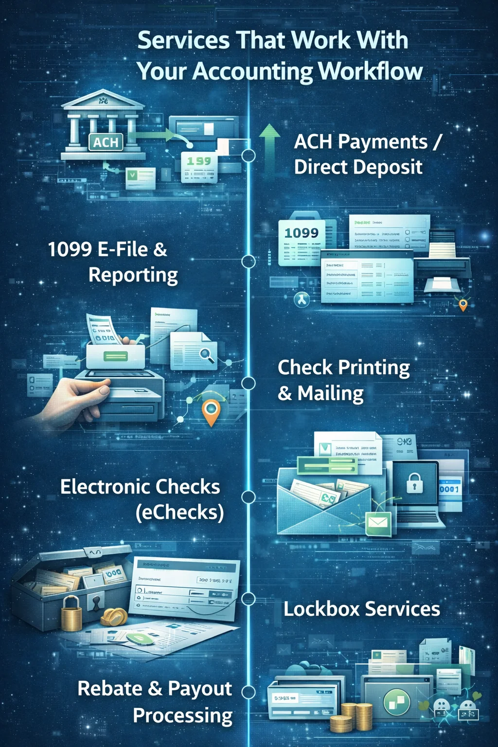 Our integrations support multiple outbound and inbound workflows, including ACH payments, check printing and mailing, electronic checks (eChecks), rebate and payout programs, lockbox services, and 1099 filing. All outputs are designed to support clean reconciliation inside your accounting platform.