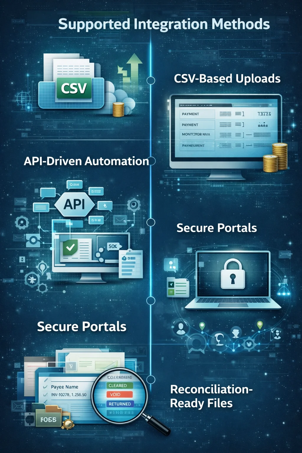 Yes. CheckIssuing is designed to work alongside your existing accounting or ERP platform — not replace it. We support both CSV-based batch exports and API-driven automation, allowing your team to continue running payments from your system of record while we handle execution, delivery, and reconciliation outputs.